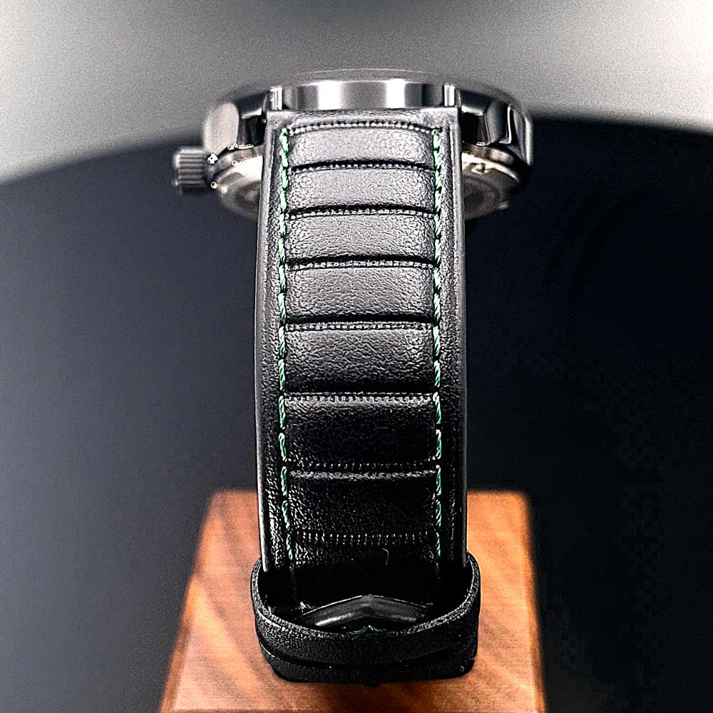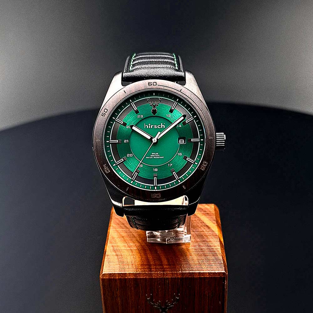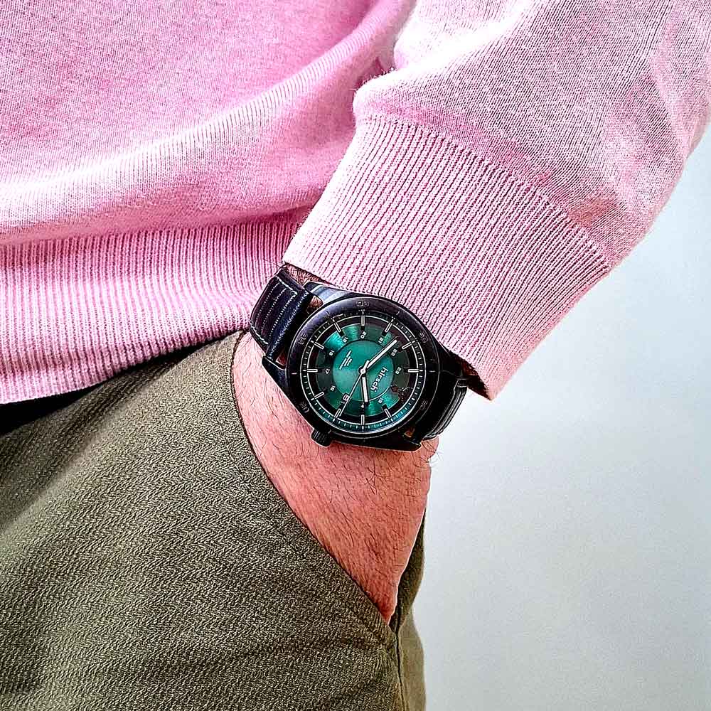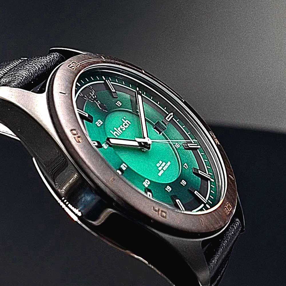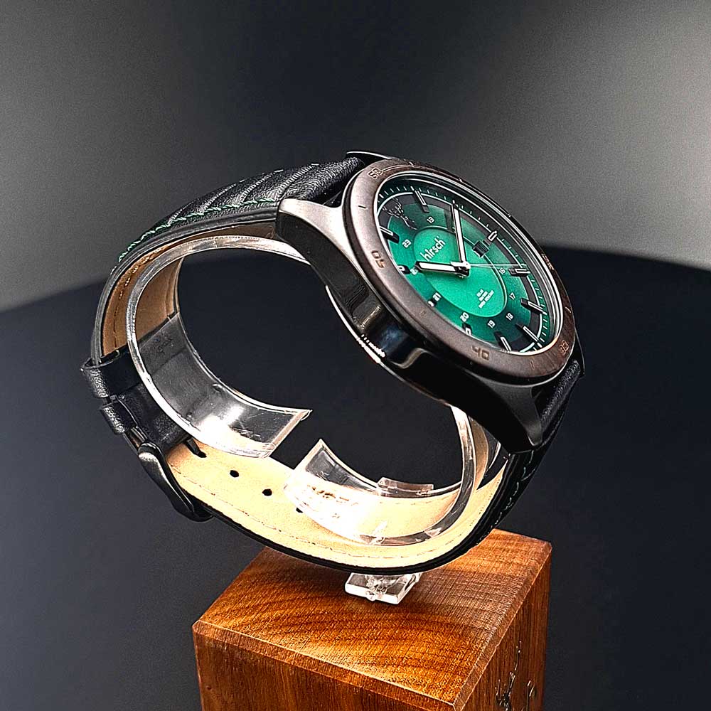 Das Zifferblatt im satten Waldbraun erzeugt eine kraftvolle Wirkung und außerdem harmoniert es perfekt mit den sorgfältig gearbeiteten Holzdetails. Diese setzen einen natürlichen Akzent und zugleich bringen sie Wärme und Struktur in das Design. Das robuste Edelstahlgehäuse ergänzt die dunklen Farbtöne und dadurch entsteht ein stimmiger, eleganter Gesamteindruck. Das vegane AppleSkin™-Armband liegt angenehm am Handgelenk und außerdem unterstreicht es den hochwertigen Look.