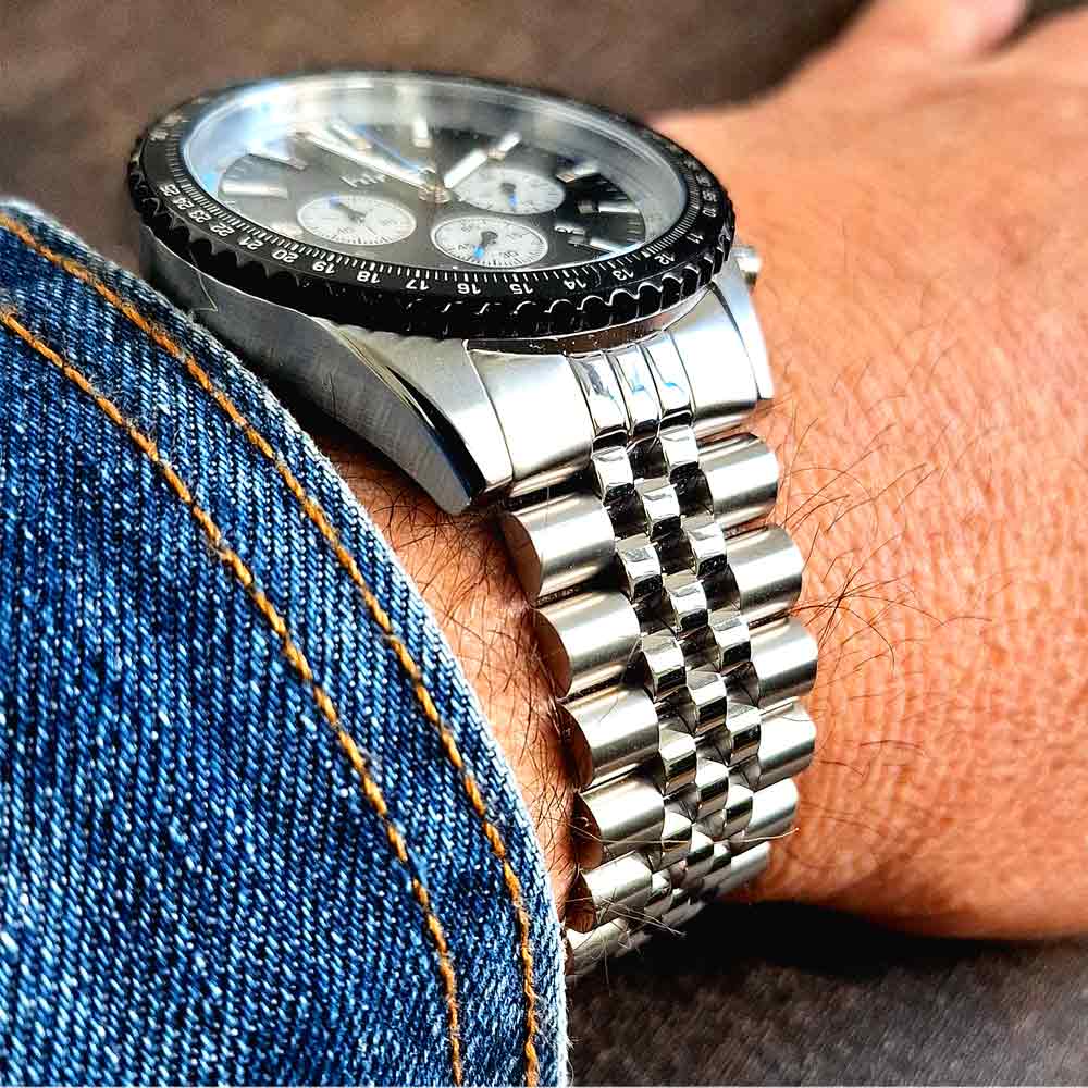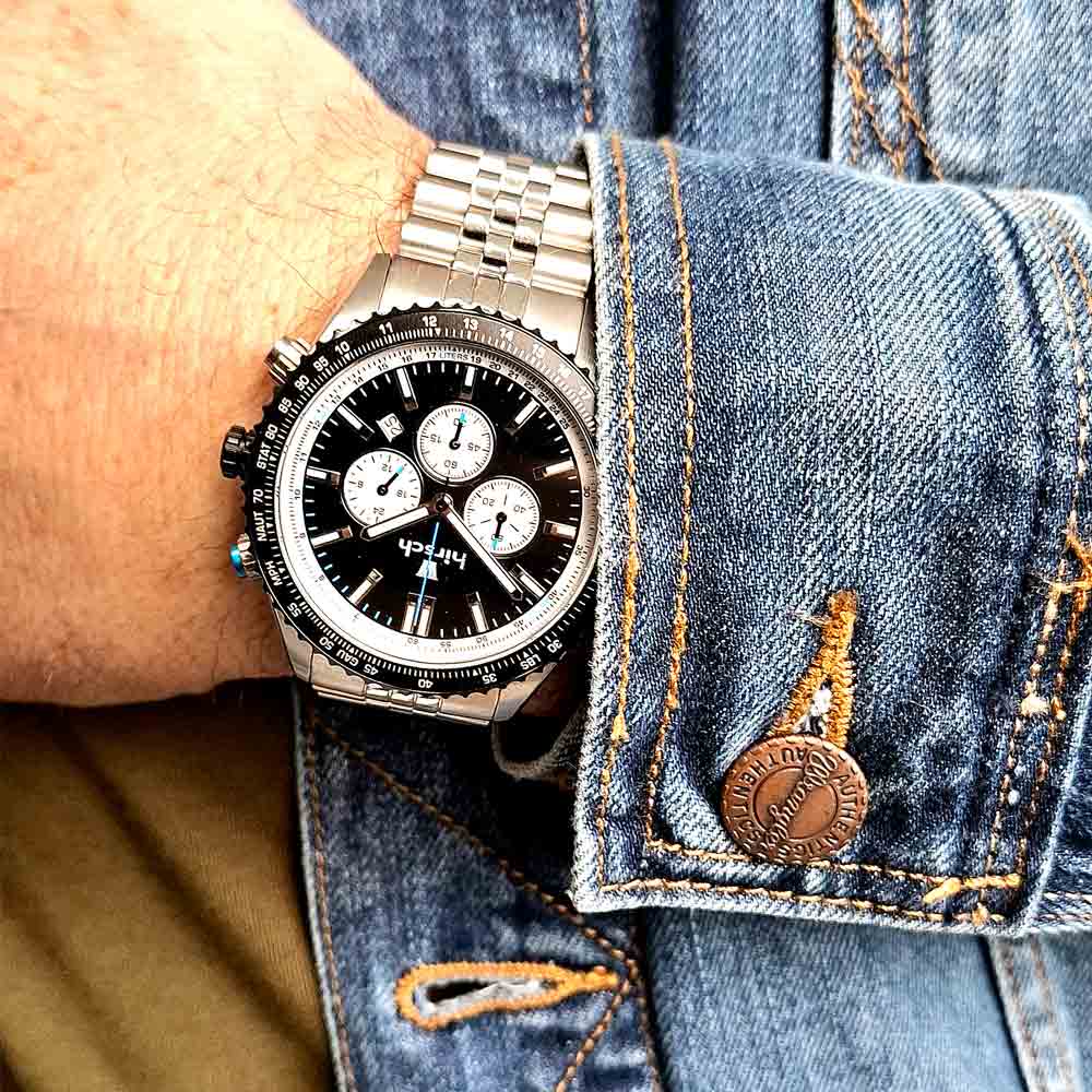 Der Fliegerchrono Silber verbindet moderne Eleganz und technische Stärke zu einem harmonischen Gesamtbild. Das helle Edelstahlgehäuse, die schwarze Rechenschieber-Lünette sowie das markante Präsidenten-Edelstahlarmband erzeugen einen klaren, hochwertigen Look. Das kontrastreiche Zifferblatt bietet sehr gute Ablesbarkeit, und die integrierte Schiebelehre erweitert die Uhr um einen praktischen, funktionalen Aspekt. Dadurch wirkt der Chronograph sportlich und zugleich professionell und eignet sich hervorragend für Männer, die Präzision und klare Linien schätzen und dabei Wert auf ein ausdrucksstarkes Design legen.